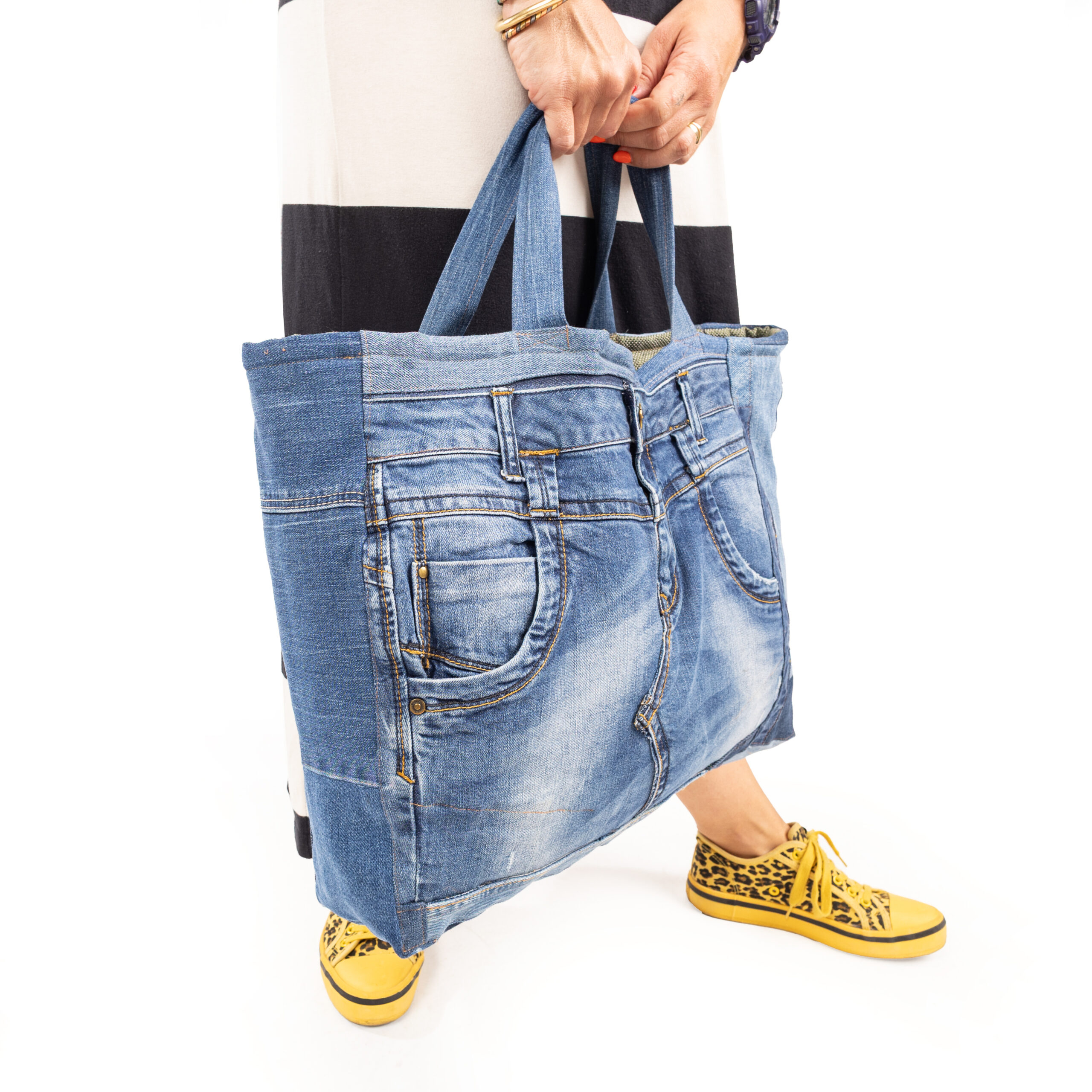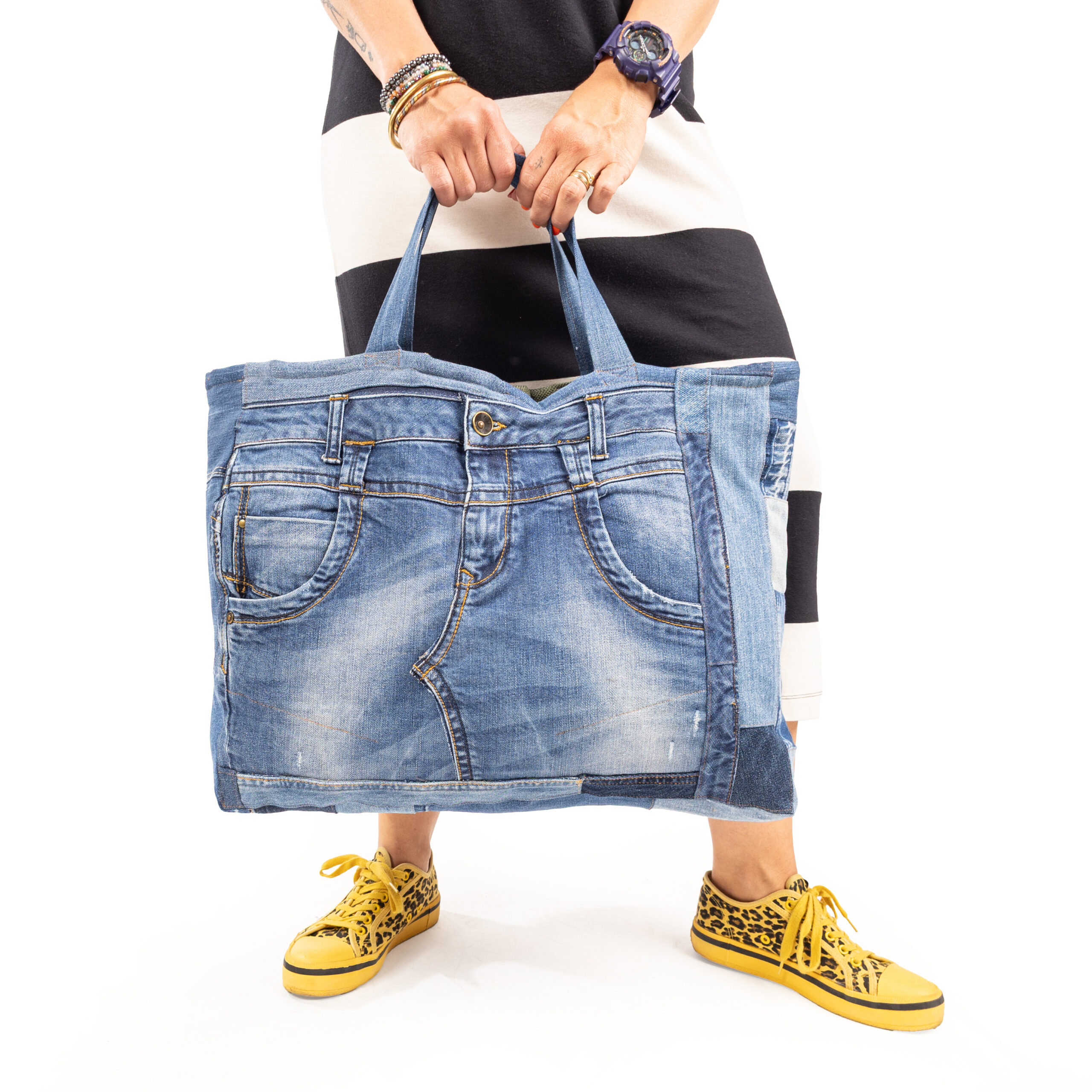 Ręcznie szyta z wyselekcjonowanych jeansów z drugiego obiegu — każdy egzemplarz jest unikatowy. Solidna, pojemna i wygodna, idealny na co dzień i w podróży torba.