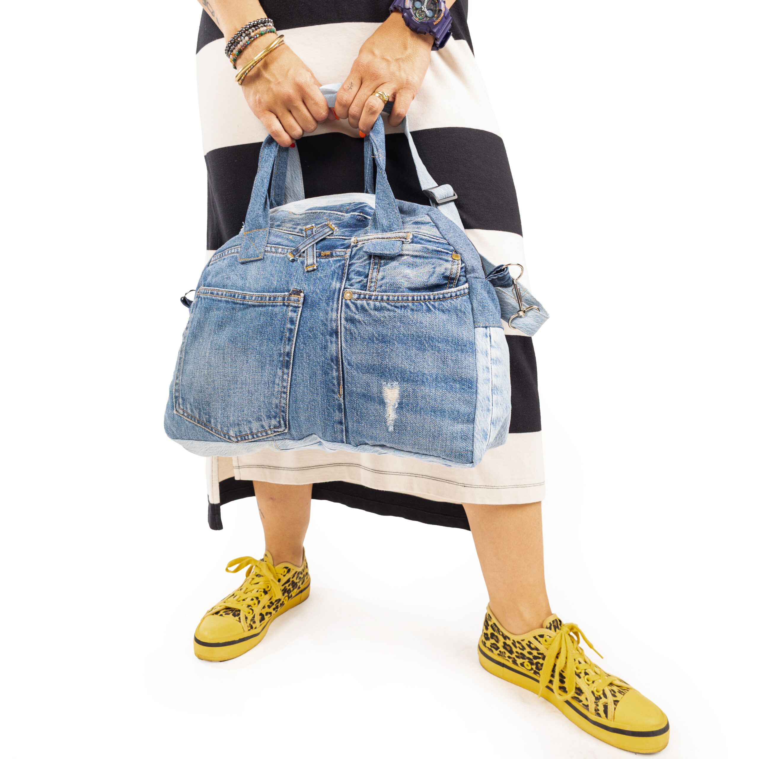 Ręcznie szyta z wyselekcjonowanych jeansów z drugiego obiegu — każdy egzemplarz jest unikatowy. Solidna, pojemna i wygodna, idealny na co dzień i w podróży torba.